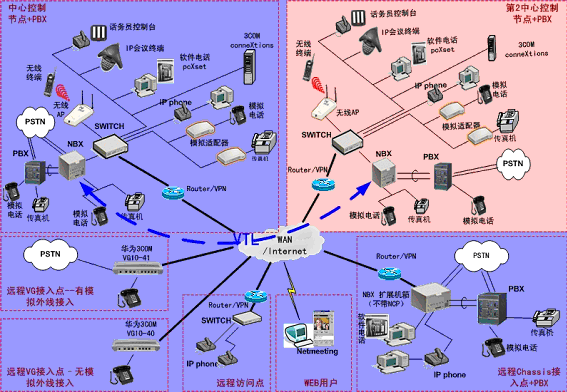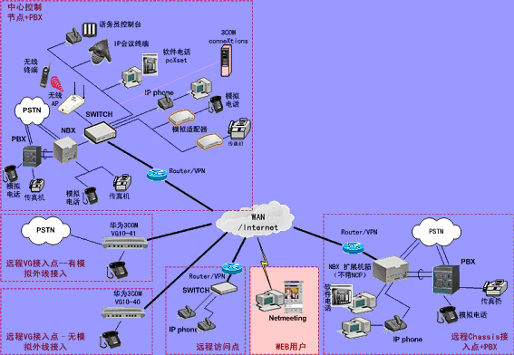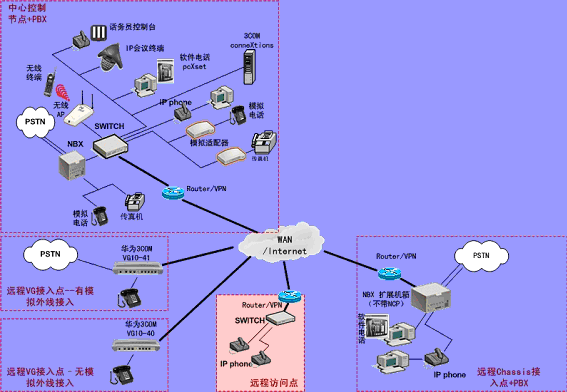 ③.遠(yuǎn)程接入的辦公室不再需要專用的 PBX, 只需要將3Com NBX電話終端接入到WAN網(wǎng)中,就能地實現(xiàn)在WAN或Internet上與3Com