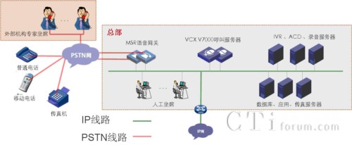 設(shè)備介紹:H3C VCX V7005完成呼叫處理;結(jié)合網(wǎng)音中間件軟件完成自動語音應(yīng)答、人工智能排隊、錄音、話務(wù)統(tǒng)計輸出等功能;MSR語音網(wǎng)關(guān)完成PSTN落地功能。