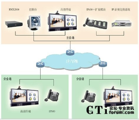 每個(gè)會(huì)場(chǎng)分配一個(gè)專(zhuān)用的IP地址,終端設(shè)置一部Polycom IP550電話, 在中心會(huì)場(chǎng)的指揮電話及擴(kuò)展模塊上設(shè)置每個(gè)分會(huì)場(chǎng)快速呼叫功能鍵,中心會(huì)場(chǎng)的管理人員只需按下IP650及擴(kuò)展模塊上的對(duì)應(yīng)于各分會(huì)場(chǎng)的快捷按鍵,即可迅速接通各個(gè)分會(huì)場(chǎng)。