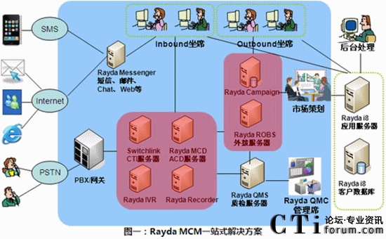Rayda MCM多渠道呼叫管理平臺(tái),是呼叫中心基礎(chǔ)呼叫業(yè)務(wù)的信息化支撐平臺(tái)系統(tǒng)。Rayda MCM以先進(jìn)的呼叫信息交互為核心,涵蓋呼叫中心系統(tǒng)所必須的ACD、IVR、PD、錄音、質(zhì)檢等基本功能,更整合了統(tǒng)一通信、電話營銷等多項(xiàng)企業(yè)迫切需要的功能。MCM支持支持從板卡、傳統(tǒng)PBX到IPPBX網(wǎng)絡(luò)等各種接入方式的建設(shè),支持從單點(diǎn)到分布式等各種組網(wǎng)方式,適應(yīng)從中小企業(yè)到外包型等各種規(guī)模呼叫中心的需求。