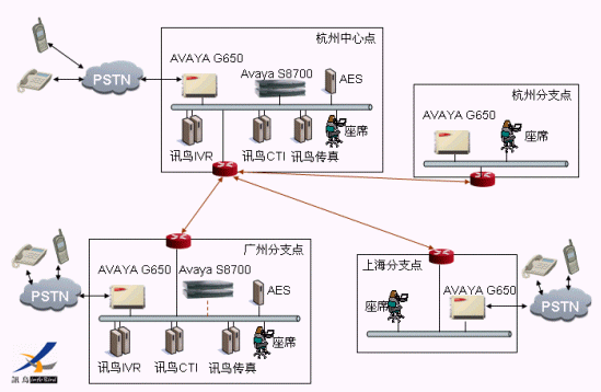 整個(gè)呼叫中心包括一個(gè)中心點(diǎn)杭州創(chuàng)業(yè)大廈,3個(gè)分支點(diǎn)分別在杭州華星大廈、上海與廣州。實(shí)現(xiàn)中繼分散接入,座席分散與集中相結(jié)合,整個(gè)呼叫中心集中控制的方式。杭州中心點(diǎn)采用一套AVAYA S8710、一套訊鳥CTI/IVR/傳真集中控制,其他各點(diǎn)通過(guò)G650接入。其中廣州分支點(diǎn)由于座席數(shù)較多,單獨(dú)部署一臺(tái)AES服務(wù)器、一套訊鳥CTI/IVR/傳真服務(wù)器。廣州點(diǎn)的一套AVAYA S8700作為本地再生服務(wù),一旦廣域網(wǎng)電路中斷,立即接管承擔(dān)一個(gè)獨(dú)立的呼叫中心,AES服務(wù)器、訊鳥CTI、IVR服務(wù)器隨之與新的AVAYA S8700交換機(jī)聯(lián)接,保證24小時(shí)不間斷運(yùn)行的要求。