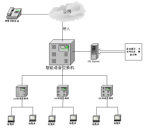 公安綜合信息呼叫中心系統(tǒng)就是在呼叫中心基礎上利用先進的CTI技術(shù),將現(xiàn)存和即將開通的信息系統(tǒng)有機地整合起來;即把數(shù)字語音技術(shù)、計算機網(wǎng)絡技術(shù)、通信、交換等先進技術(shù)結(jié)合起來,結(jié)合公安業(yè)務特點,擴展和增強公安信息應用系統(tǒng)的功能,使現(xiàn)有數(shù)據(jù)庫資源得到充分利用;還可使一部分可以公開或應該公開的公安信息向社會提供增值服務,如出入境辦理查詢、身份證查詢、車輛駕駛員信息查詢等。本系統(tǒng)以110、119、122綜合報警服務為龍頭,以各項公安工作信息化為主要內(nèi)容,以公安計算機信息、通信網(wǎng)絡為依托,以對內(nèi)提供信息多種方式綜合利用、對外提供社會服務為目的,以當前先進的INTENNET、CTI、數(shù)據(jù)庫技術(shù)為手段,建立起的對內(nèi)統(tǒng)一受理、指揮調(diào)度、快速反應、協(xié)同作戰(zhàn);對外警務公開、信息咨詢、查詢、投訴舉報為一體的公安綜合信息呼叫中心系統(tǒng)。