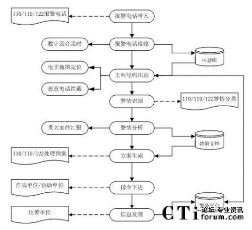 該系統(tǒng)主要分為電信子系統(tǒng)(完成聯(lián)動(dòng)中心與各電信公司之間話音的傳輸、交換和分配,以及主叫號(hào)碼和主叫地址的自動(dòng)查詢和傳輸?shù)龋⒔泳行淖酉到y(tǒng)(統(tǒng)一接聽和處理市民的報(bào)警、求助電話)、指揮調(diào)度子系統(tǒng)(或稱為處警中心,通過(guò)直觀的地理信息系統(tǒng)和數(shù)據(jù)庫(kù),可以對(duì)所有的資源和警力分布了如指掌。通過(guò)一體化的無(wú)線數(shù)據(jù)傳輸和無(wú)線調(diào)度臺(tái)進(jìn)行方便的統(tǒng)一管理,指揮和調(diào)度)、信息網(wǎng)絡(luò)子系統(tǒng)(聯(lián)動(dòng)中心的骨干網(wǎng)絡(luò),把各種數(shù)據(jù)數(shù)庫(kù)、接處警席位、移動(dòng)的警用車載計(jì)算機(jī)等互聯(lián)在一起,形成一個(gè)強(qiáng)大的信息網(wǎng)絡(luò))、無(wú)線指揮調(diào)度通信子系統(tǒng)、大屏幕顯示子系統(tǒng)、地理信息子系統(tǒng)、GPS/GIS子系統(tǒng)。