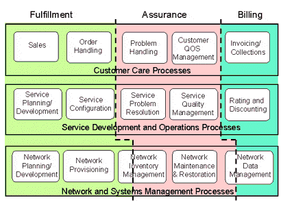 在TMF的模型中,從功能上來(lái)看,OSS主要包括三大功能:業(yè)務(wù)開(kāi)通(Service Fulfillment);業(yè)務(wù)保障(Service Assurance);計(jì)費(fèi),又稱業(yè)務(wù)計(jì)量(Service