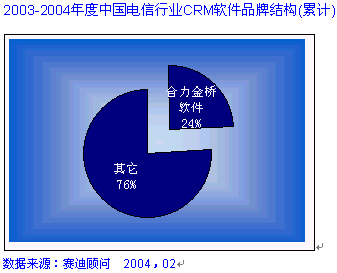 HOLLYCRM(合力金橋軟件)公司作為實力卓越的CRM主流廠商, 致力于提供最專業(yè)化的應(yīng)用軟件和服務(wù),提供以客戶為核心的信息化解決方案,服務(wù)領(lǐng)域跨越電信運營商、金融業(yè)、制造業(yè)等行業(yè)。在電信行業(yè)的CRM市場中,合力金橋軟件處于穩(wěn)固領(lǐng)先位置, 其推出的客戶關(guān)系管理解決方案,覆蓋協(xié)作型、運營型和分析型的全部范疇。在CRM產(chǎn)業(yè)在2003年的中國發(fā)展態(tài)勢整體放緩的大環(huán)境下, HOLLYCRM卻一枝獨秀, 在不到一年的時間里簽下中國網(wǎng)通總部、天津網(wǎng)通、山西網(wǎng)通、內(nèi)蒙聯(lián)通等大型CRM項目,積累了豐富的CRM項目實施經(jīng)驗。在累計的電信行業(yè)CRM軟件市場中,合力金橋軟件一家占有份額就達(dá)到24%, 合力金橋軟件此次在CCID年度研究報告中倍受矚目可謂眾望所歸, 充分說明了其CRM產(chǎn)品在高端行業(yè)的領(lǐng)軍地位, 如圖: