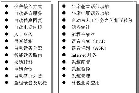1. 接入及交換處理系統(tǒng)。此部分重點考慮用戶的呼叫接入和呼出、呼叫轉(zhuǎn)接處理需求,分析提供電話、傳真、信函、Web、E-mail、WAP、短信、視頻等方式的接入選擇?紤]分析用戶呼叫要求和數(shù)據(jù),將該數(shù)據(jù)傳遞給業(yè)務(wù)處理和業(yè)務(wù)管理系統(tǒng),同時接收業(yè)務(wù)處理和業(yè)務(wù)管理系統(tǒng)的交換請求,對各種電話交換資源、語音資源、傳真資源、坐席資源等進行統(tǒng)一管理和調(diào)度分配,進行呼叫的排隊和交換。它包括PBX/ACD (自動呼叫分配)、IVR(交互語音應(yīng)答)、CTI、傳真系統(tǒng)、短信平臺、坐席軟電話、錄音、呼出系統(tǒng)、ICC(Internet呼叫中心)等子系統(tǒng)。