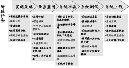 根據(jù)產(chǎn)品選型的結(jié)果和選定的系統(tǒng)集成商,由甲乙雙方人員組成項目組,對項目進行實施。此階段最容易出現(xiàn)各種問題,如果處理不好,很可能導(dǎo)致呼叫中心的建設(shè)失敗。這個環(huán)節(jié)很重要的一點就是系統(tǒng)集成商是否有成熟的實施方法論來指導(dǎo)項目的實施,降低項目實施中的風(fēng)險,確保項目能順利實施。圖4是HOLLYCRM公司項目實施方法論的一個概貌,可供大家參考。