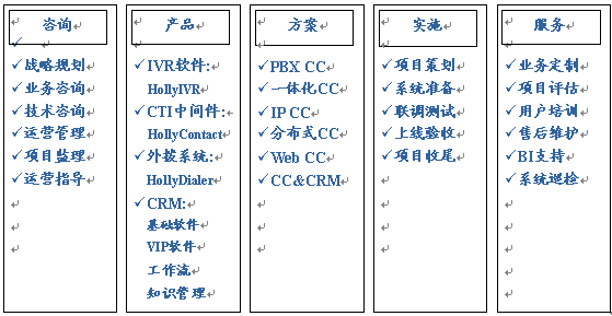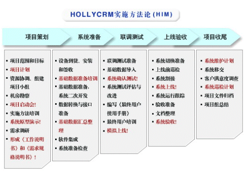 HOLLYCRM(合力金橋軟件)公司是國內(nèi)最早從事呼叫中心應用軟件開發(fā)與服務公司,在多年的實踐經(jīng)驗基礎上形成了完整的“456”呼叫中心“項目實施方法論”(HIM:HOLLYCRM Implementary Methodology),即“四大實施策略、五個項目階段、六大管理專題”。該體系的有效運行對公司項目的成功上線和推進軟件產(chǎn)品的成熟將起到至關重要的作用。