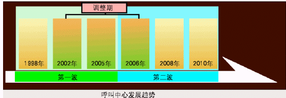 在合力金橋軟件公司的副總裁盧毅看來,1998年以前是呼叫中心在中國市場的導(dǎo)入期,1998~2005年第一波呼叫中心的建設(shè)期,直接促成了整個市場的擴大和呼叫中心座席數(shù)的大幅增加;在2006年~2010年,由于受到中國加入WTO、2008年北京舉辦奧運會、2010年上海舉辦世界博覽會等社會政治、經(jīng)濟事件的推動,將會出現(xiàn)第二波的呼叫中心建設(shè)風潮;而從2002年~2006年中期是個調(diào)整期,第一波的呼叫中心建設(shè)此時進入運營期和消化期,同時為第二波的建設(shè)應(yīng)用積蓄力量。