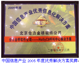 2006年1月10日,北京。中國(guó)計(jì)算機(jī)用戶(hù)協(xié)會(huì)"2005年度企業(yè)及產(chǎn)品頒獎(jiǎng)典禮"在世紀(jì)金源大飯店隆重召開(kāi)。在Call Center(呼叫中心)及CRM(客戶(hù)關(guān)系管理)領(lǐng)域位居業(yè)界領(lǐng)先地位的HOLLYCRM(合力金橋軟件)公司自主知識(shí)產(chǎn)權(quán)的HollyC6呼叫中心解決方案再度成為業(yè)界關(guān)注焦點(diǎn),榮獲"中國(guó)信息產(chǎn)業(yè)2005年度優(yōu)秀解決方案"大獎(jiǎng)。