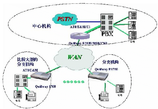 。。如圖是一個(gè)典型的企業(yè)網(wǎng)IP電話組網(wǎng)方案,在總部采用Quidway®R3640E/3680E路由器作為中心語音網(wǎng)關(guān)設(shè)備,在E1線路上實(shí)現(xiàn)VoIP功能;如果機(jī)構(gòu)規(guī)模不是很大,也可以采用AT0/E&M連接PBX;在各分支機(jī)構(gòu)及網(wǎng)點(diǎn),則可采用Quidway®