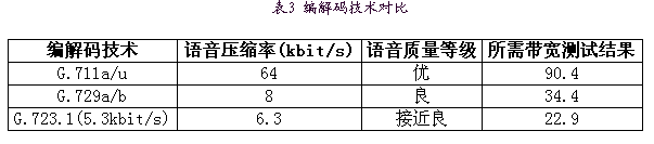 為進(jìn)一步節(jié)省帶寬,又采用語(yǔ)音激活檢測(cè)技術(shù)(VAD)及舒適噪音生成(CNG)技術(shù),VAD技術(shù)只有當(dāng)檢測(cè)到語(yǔ)音處于活動(dòng)狀態(tài)時(shí),編碼器的輸出信號(hào)才被送到網(wǎng)絡(luò)上,因此節(jié)省了帶寬。而在靜音時(shí)段采用CNG技術(shù),生成與背景噪聲相匹配的較舒適的靜音,避免了用戶(hù)有不自然的交談感覺(jué),保證通話質(zhì)量。實(shí)際測(cè)試結(jié)果如表4,采用G.72920ms打包+VAD技術(shù)節(jié)省了近75%的帶寬。