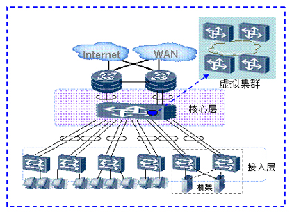 如上圖所示,整個(gè)數(shù)據(jù)中心網(wǎng)絡(luò)通過虛擬集群技術(shù),多個(gè)核心層設(shè)備虛擬為一臺(tái)設(shè)備。通過增加核心節(jié)點(diǎn),提供無阻塞的網(wǎng)絡(luò)能力,接入更多服務(wù)器。服務(wù)器的規(guī)模可以從3000臺(tái)“無級(jí)擴(kuò)展”到數(shù)萬臺(tái)。在滿足企業(yè)日益增長(zhǎng)的業(yè)務(wù)需求的同時(shí),并不增加網(wǎng)絡(luò)的復(fù)雜度,減少管理和維護(hù)的成本。