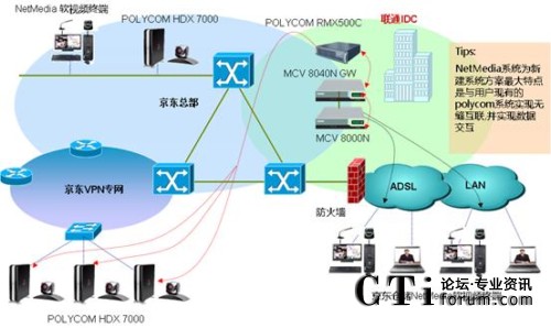 系統(tǒng)建設充分利用現(xiàn)有網絡資源,在業(yè)務層面上充分做到與用戶現(xiàn)有資源對接.,實現(xiàn)與原有POLYCOM H.323系統(tǒng)對接,同時在全國各區(qū)共40個倉儲系統(tǒng)建設一套高清網絡視頻系統(tǒng),以滿足企業(yè)內部遠程業(yè)務應用.系統(tǒng)建成后不但可以實現(xiàn)公司高層、各大區(qū)組織成員可以通過原有H.323系統(tǒng)召開會議同時市場前沿的各區(qū)倉儲系統(tǒng)也可通過新建設的Netmedia系統(tǒng)實時能參加會議,滿足企業(yè)內部實時、廣泛、有效、低成本溝通需要。