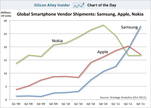 圖:全球智能手機(jī)出貨量:諾基亞、三星和蘋(píng)果
