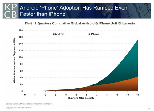 圖:Android和iPhone前11季度累計(jì)出貨量對(duì)比