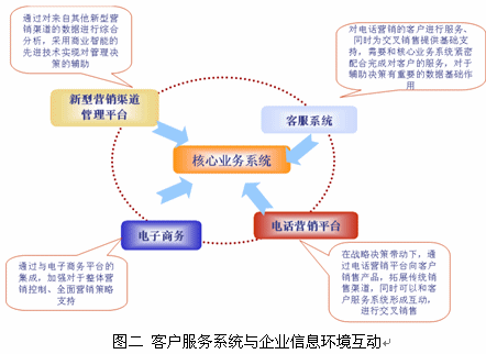 客戶服務(wù)系統(tǒng)不是孤立的系統(tǒng),是能夠與客戶現(xiàn)有信息環(huán)境,包括:核心業(yè)務(wù)系統(tǒng)、多渠道營銷、電子商務(wù)等進(jìn)行互動(dòng)的智能信息系統(tǒng),從而使呼叫中心成為企業(yè)的戰(zhàn)略資產(chǎn),幫助企業(yè)提升客戶滿意度、深度挖掘客戶價(jià)值?蛻舴⻊(wù)系統(tǒng)與企業(yè)其它信息系統(tǒng)的互動(dòng)可以通過圖二反映。