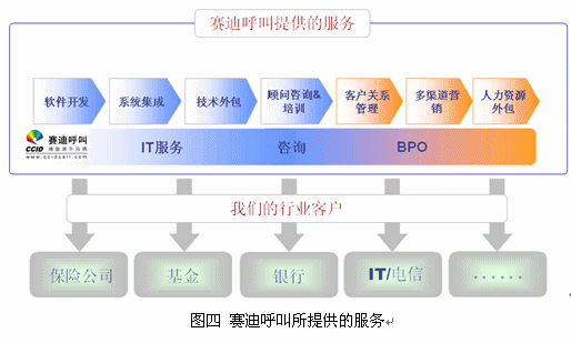 同時(shí),賽迪呼叫所推薦給企業(yè)的并非只是軟件,而是結(jié)合了賽迪呼叫豐富的運(yùn)營服務(wù)經(jīng)驗(yàn)、技術(shù)服務(wù)能力的全方位信息化服務(wù)。賽迪呼叫的這種全面的信息化服務(wù),涵蓋IT服務(wù)、咨詢服務(wù)、BPO等,圖四給出了相應(yīng)展示。