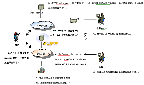 由于以上兩種原因,網(wǎng)通亟待開發(fā)新型的客戶服務平臺,既可用于解決客戶服務的需求,亦可作為開展增值業(yè)務的平臺。FineSupportIP呼叫中心產(chǎn)品是北極星軟件提出的主要基于IP架構的新型呼叫中心,除具備傳統(tǒng)呼叫中心的各項功能和以“電話”為主的接入方式之外,著重提供“Internet Call Center”或Web Call Center的服務,系統(tǒng)構建于網(wǎng)通IP網(wǎng)絡平臺上,將網(wǎng)通傳統(tǒng)業(yè)務和新型增值業(yè)務完美融合在起,成就中國網(wǎng)通公司“e時代基礎設施提供商”的定位。