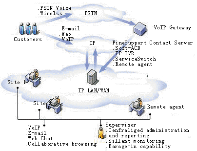 FineSupport發(fā)揮了軟交換和VoIP技術(shù)的優(yōu)勢(shì),并融合了Internet的特性,使顧客與呼叫中心之間不僅可以通過(guò)語(yǔ)音進(jìn)行通信,還可以通過(guò)電子郵件、傳真、文字交談進(jìn)行通信,甚至可以實(shí)現(xiàn)在線推送網(wǎng)頁(yè)、在線網(wǎng)頁(yè)導(dǎo)航等業(yè)務(wù)。呼叫中心的客服人員只需具備一臺(tái)多媒體電腦和一副耳麥,即可向顧客提供完備的服務(wù)。