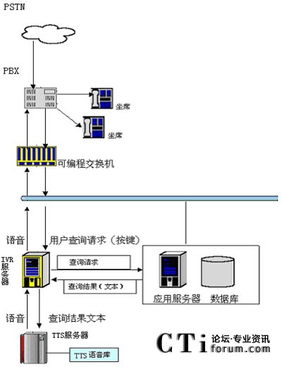 用戶撥打統(tǒng)一特服號(hào)碼進(jìn)入客戶服務(wù)系統(tǒng),經(jīng)過自動(dòng)語音系統(tǒng)提示,選擇公共信息查詢項(xiàng)目。用戶可以通過電話提交他的查詢請(qǐng)求(比如使用按鍵方式),IVR服務(wù)器收到請(qǐng)求后會(huì)向其他應(yīng)用服務(wù)器提交此查詢請(qǐng)求,當(dāng)IVR得到查詢結(jié)果后,他會(huì)將文本形式的查詢結(jié)果交給jTTS服務(wù)器,jTTS服務(wù)器會(huì)返回查詢結(jié)果的語音形式,最終語音會(huì)在坐席上播放,用戶就可以聽到他剛才所要查詢的信息。
