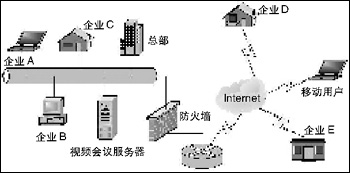 ● Conference可以滿足企業(yè)用戶桌面和會議室級別會議的需求,并且在一個系統(tǒng)中,可以同時進(jìn)行多個會議而互不干擾,使應(yīng)用更加方便,典型的應(yīng)用示意圖如下所示: