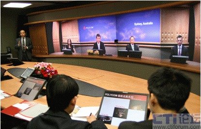我們參與體驗(yàn)的8個(gè)人在面向屏幕的一側(cè)坐下,寶利通技術(shù)人員在位于會(huì)議桌正中的觸摸屏上輕輕點(diǎn)了一下,對(duì)面瞬間出現(xiàn)了4張微笑的面孔,整個(gè)畫(huà)面的色彩和亮度都非常柔和,感覺(jué)對(duì)面的座位突然間被坐滿了。技術(shù)人員介紹說(shuō)我們已經(jīng)和澳大利亞辦公室接通了,我仔細(xì)觀察才發(fā)現(xiàn),除了背景墻上的“Sydney,