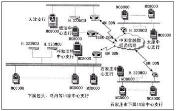 為推進金融行業(yè)的金融電子化進程,并充分利用中國國家金融數據通信網(CNFN)的資源,中國人民銀行天津大區(qū)行于1999年建立了首個運行在CNFN上的基于IP的H.323電視會議網,實現了華北范圍內天津、內蒙古、河北、山西兩省一區(qū)一市的36家人民銀行機構的會議電視聯網。VCON公司提供的基于IP的H.323視頻會議第四代解決方案在該系統(tǒng)中發(fā)揮了重要作用。