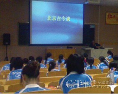 7月25日中央財(cái)經(jīng)大學(xué)的課堂里,近百位奧運(yùn)觀眾呼叫中心的志愿者聆聽了北京第二外國(guó)語(yǔ)大學(xué)西班牙語(yǔ)呂龍根教授的講座——“北京古今談”。呂教授幽默的語(yǔ)言、澎湃的激情,感染并征服了在座的每一位志愿者。教授從中國(guó)古代的六大古都(北京、西安、洛陽(yáng)、開封、南京、杭州)談到古代北京的五朝建都(遼、金、元、明、清),從北京偉大的中軸線,談到北京建筑的風(fēng)水學(xué),從北京的胡同和四合院,談到北京的著名小吃,等等等等?芍^是古今暢想、無(wú)所不談,真正讓我們領(lǐng)略了何為學(xué)者風(fēng)范。