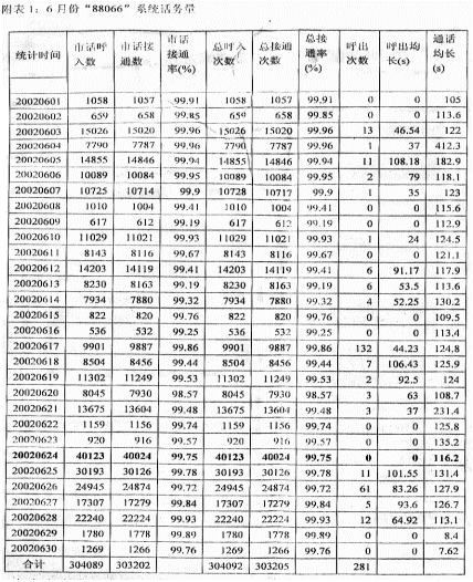 系統(tǒng)在2002年6月份的系統(tǒng)話(huà)務(wù)量情況見(jiàn)附表1。