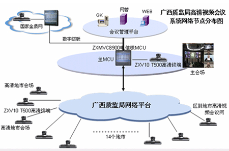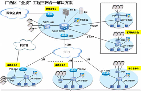 憑借全面的融合通信產(chǎn)品和解決方案、豐富的電子政務(wù)工程建設(shè)和實施經(jīng)驗,中興通訊為廣西“金質(zhì)工程”(一期)系統(tǒng)“量身定做”出一整套基于IP融合、使用方便靈活的解決方案:將整個系統(tǒng)分為兩個部分,即區(qū)質(zhì)監(jiān)局一級節(jié)點信息中心、各地市質(zhì)監(jiān)局及相關(guān)研究機構(gòu)共計15個二級節(jié)點信息中心,在管理上體現(xiàn)垂直的系統(tǒng)架構(gòu)。整個網(wǎng)絡(luò)可以看作一個分級的星形網(wǎng)絡(luò),結(jié)構(gòu)簡單、易于擴(kuò)展。