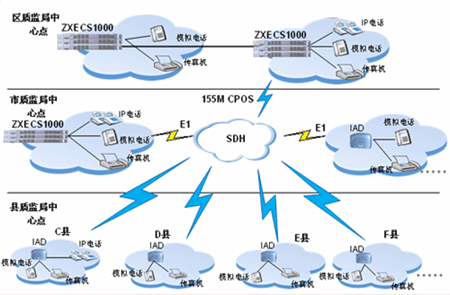 其它各接入節(jié)點采用IAD設(shè)備接入到ZXECS 1000,最大程度的降低了語音接入的成本,同時IAD靈活的擴(kuò)展性利于今后的升級。