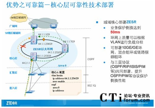 核心交換機(jī)主要是匯聚下行的全千兆智能路由交換機(jī),所以要求設(shè)備提供高密度板卡和線速轉(zhuǎn)發(fā)的能力。同時(shí)保證對(duì)下行端口進(jìn)行帶寬控制,中興采用萬(wàn)兆路由交換機(jī)ZXR10 8905來(lái)滿足用戶的需求。ZXR10 8900系列萬(wàn)兆路由交換機(jī)是中興通訊推出的新一代的大容量核心/匯聚路由交換機(jī)系列產(chǎn)品,主要定位于運(yùn)營(yíng)商IP城域網(wǎng)、校園網(wǎng)、電子政務(wù)網(wǎng)和大型企事業(yè)網(wǎng)等網(wǎng)絡(luò)的核心/匯聚層。ZXR10 8900系列萬(wàn)兆路由交換機(jī)基于先進(jìn)的模塊化理念進(jìn)行設(shè)計(jì),并采用了基于多處理器并行處理機(jī)制和Crossbar空分交換結(jié)構(gòu)的體系結(jié)構(gòu),關(guān)鍵模塊均采用可以1:1進(jìn)行冗余備份。ZXR10 8900系列具備10GE、GE、FE等各種豐富的接口模塊,并全面支持IPv4、IPv6、組播、QOS、帶寬控制等業(yè)務(wù)功能。ZXR10 8900系列整個(gè)系統(tǒng)所具備的高可靠性、高擴(kuò)展性、良好的業(yè)務(wù)能力等特點(diǎn),可以滿足各種網(wǎng)絡(luò)核心/匯聚層的建設(shè)需求。