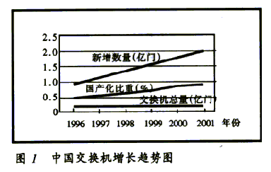 2000年,中國(guó)公用通信網(wǎng)上局用程控交換機(jī)的總?cè)萘窟_(dá)到1.79億門(mén),國(guó)內(nèi)生產(chǎn)設(shè)備的比重達(dá)80%。預(yù)計(jì)2001年新增交換機(jī)容量2100萬(wàn)門(mén),總?cè)萘窟_(dá)到2億門(mén),國(guó)內(nèi)生產(chǎn)設(shè)備的比重超過(guò)85%,增長(zhǎng)趨勢(shì)見(jiàn)圖1。