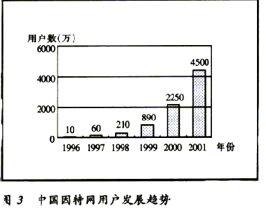 據(jù)CNNIC統(tǒng)計(jì)的數(shù)據(jù)表明,到2000年12月31日止,中國(guó)的因特網(wǎng)用戶達(dá)到2250萬(wàn)戶,上網(wǎng)計(jì)算機(jī)892萬(wàn)臺(tái),預(yù)計(jì)2001年中國(guó)將有超過(guò)4500萬(wàn)的網(wǎng)民。中國(guó)域名總數(shù)為12.2萬(wàn)個(gè),WWW站點(diǎn)數(shù)26.54萬(wàn)個(gè)。中國(guó)因特網(wǎng)的發(fā)展速度驚人,與國(guó)際因特網(wǎng)的發(fā)展速度相當(dāng)。中國(guó)因特網(wǎng)用戶發(fā)展趨勢(shì)見(jiàn)圖3。