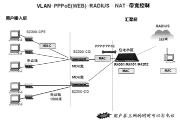 圖2所示的是VDSL技術與以太網技術聯(lián)合打造的新型接入方案。武漢烽火網絡公司生產的S2300系列VDSL交換機使用戶在現(xiàn)有電話線路上獨立享用固定的獨立的帶寬,安全地進行數(shù)據(jù)連接,同時以太網的PPPoE認證、NAT地址變換等功能又將用戶帶入迷幻的網絡世界。
