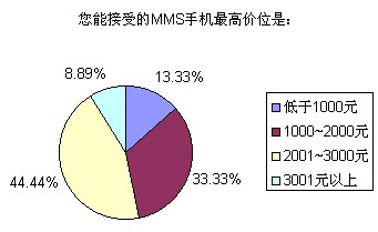 題7對(duì)終端提供商在定價(jià)方面很有幫助的,A~D的答案被選幾率分別為13.33%、33.33%、44.44%和8.89%,看來1000~3000元的價(jià)位是用戶關(guān)注的焦點(diǎn),相對(duì)于現(xiàn)在的市場(chǎng)狀況,終端廠商在將來MMS上面的競(jìng)爭(zhēng)環(huán)境還是比較友好的,至少價(jià)格上處于買方市場(chǎng),可以預(yù)計(jì)當(dāng)MMS投入運(yùn)營(yíng)的頭半年,MMS終端將維持在2500~3500元以上的檔次,6~12個(gè)月以后才會(huì)真的降到2500以內(nèi)去迎合尋常百姓的消費(fèi)能力。