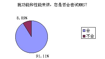 題8的調(diào)查結(jié)果對(duì)于中國(guó)移動(dòng)來講絕對(duì)是充滿誘惑的,高達(dá)91.11%的被訪者表示他們非常愿意嘗試MMS的功能和服務(wù),無疑這對(duì)ICP們(MMS服務(wù)的重要載體)也是一針強(qiáng)心劑!