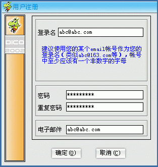 DICO下載后的安裝過程比較簡(jiǎn)單: "接收協(xié)議"后一路"下一步"就OK了。然后是注冊(cè),過程也委簡(jiǎn)單:運(yùn)行后,第一次使用時(shí)點(diǎn)"注冊(cè)"(以后使用時(shí)只要輸入用戶名或密碼登錄就是了),隨后的"用戶注冊(cè)"窗口中填寫好相關(guān)的選項(xiàng)后點(diǎn)"確定"(下圖2)就OK了!