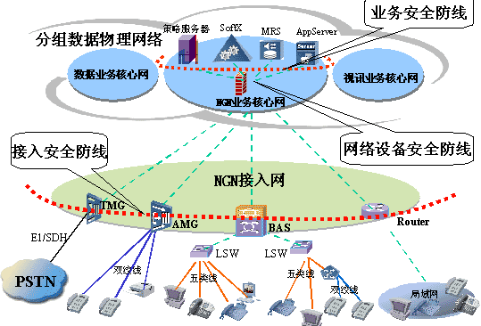 1. NGN業(yè)務網(wǎng)核心網(wǎng)絡設備(軟交換、SG、TMG)通過防火墻接入NGN業(yè)務網(wǎng),防止對關鍵設備的網(wǎng)絡攻擊。