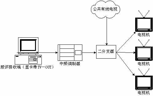 本系統(tǒng)接收端接收實(shí)時廣播時,除了用普通PC機(jī)收看,或把PC機(jī)接收到的信號輸?shù)诫娨暎ù笃粒┥鲜湛,甚至還可以接入有線電視網(wǎng)進(jìn)行播放。具體方法是通過一個接收端接收股評節(jié)目,通過帶TV-OUT的顯卡把TV信號輸出到中頻調(diào)制設(shè)備,中頻調(diào)制設(shè)備可以把基帶模擬信號轉(zhuǎn)換成一個有線電視信號,且傳輸距離遠(yuǎn),損失小,再把這個信號與有線電視信號一起接入一個二分支器(2進(jìn)1出),這就可以和公共有線電視共存,形成自己的頻道,供電視接收。