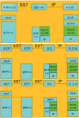 ·信令網(wǎng)關(SG)終結MTP2協(xié)議,將MTP2、MTP3之間的原語封裝為M2UA消息,在信令網(wǎng)關功能和軟交換設備間傳遞,信令網(wǎng)關與軟交換分別實現(xiàn)MTP1/2和3層功能;