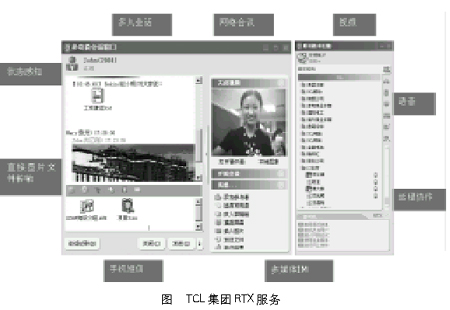 RTX產(chǎn)品支持標(biāo)準(zhǔn)的SIP、H.323 IP電話協(xié)議,并采用高質(zhì)量的QoS技術(shù)保證實時通信網(wǎng)絡(luò)質(zhì)量,使得TCL集團(tuán)公司的用戶可以與同事之間采用語音或者視頻的面對面的交流(如圖),相當(dāng)于給集團(tuán)公司的任何一位RTX用戶配備了一部集成的視頻和語音電話。目前這項服務(wù)在集團(tuán)公司非常受歡迎,尤其是遠(yuǎn)程的代表處和集團(tuán)總部之間的信息交流更直接、更快捷,在一定程度上取代了電話的功能,大大節(jié)約了通信費(fèi)用。比如,TCL空調(diào)的計劃部每天需要和全國20多個代表處的計劃處進(jìn)行數(shù)據(jù)往來,以前需要電話完成的功能現(xiàn)在通過RTX的即時文字、短信和語音對講完成,大大提高效率,節(jié)省了通信成本。