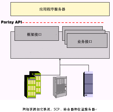 Parlay/OSA設想應用程序運行在應用服務器上,通過TCP/IP連到Parlay/OSA網(wǎng)關。