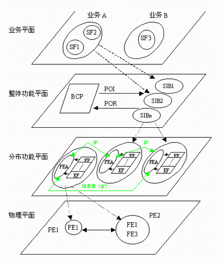 在上圖1中, SF—業(yè)務(wù)屬性;BCP—基本呼叫處理;SIB—業(yè)務(wù)無關(guān)構(gòu)筑塊;FE—功能實(shí)體; FEA—功能實(shí)體動(dòng)作;FE—物理實(shí)體;POI—起始點(diǎn);