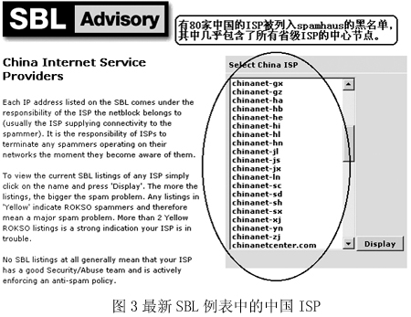 垃圾郵件損害的不只是中國的國際形象,中國反垃圾郵件聯(lián)盟的葉豪告訴記者,類似SBL(更一般的是RBL,即“實(shí)時(shí)黑名單”)這樣的服務(wù)是由國外的一些公司或第三方組織提供的,目前已經(jīng)成為國際上比較通行的防范垃圾郵件的措施。而在具備較高知名度的Spamhaus所維護(hù)的這份黑名單中,我國的ISP竟然多達(dá)80家(如圖3),幾乎所有的省級(jí)ISP都位列其中!爸袊芏啻蟮腎SP都在不同的‘黑名單’里,從這些國內(nèi)ISP發(fā)出的郵件,那些用‘黑名單’的客戶根本就收不到,F(xiàn)在‘黑名單’是比較好用的一種辦法,所以使用‘黑名單’服務(wù)的企業(yè)也越來越多,國際上針對中國的信息壁壘就越來越厲害,再不采取措施,中國就等著被全世界‘封掉’吧!”