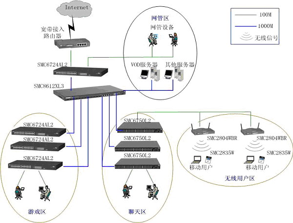 本方案采用"千兆光纖干線,百兆交換到桌面"的設(shè)計思路,各骨干線路均為1000M。骨干網(wǎng)通過高速線路接入INTERNET,網(wǎng)吧內(nèi)實現(xiàn)主干千兆交換、百兆到點,整個網(wǎng)吧內(nèi)實現(xiàn)無阻塞通信。根據(jù)顧客的不同消費需求,將網(wǎng)吧分為了網(wǎng)絡(luò)游戲區(qū)、聊天區(qū)、貴賓區(qū)等,根據(jù)不同區(qū)域的特點,細化了不同網(wǎng)絡(luò)的解決方案。方案中采用的核心設(shè)備和二層設(shè)備都支持802.1Q標準VLAN和IGMP組播協(xié)議,為VOD、多媒體娛樂等豐富應(yīng)用的開展打下了堅實的基礎(chǔ) 。通過劃分VLAN,MAC地址綁定來劃分了不同類型用戶,很好地滿足網(wǎng)吧的各項業(yè)務(wù)應(yīng)用需求。此外,SMC的豐富無線網(wǎng)絡(luò)產(chǎn)品可以很靈活的滿足網(wǎng)吧的組網(wǎng)需求,投資少、施工快。在提供高性能的同時,還保證很好的安全性,既支持基于802.11b標準的安全機制,又支持動態(tài)安全鏈路,以及基于802.1x的增強性安全或認證功能。