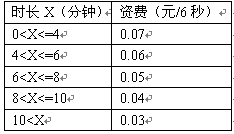例3,國內長途話費在時長不超過4分鐘的情況下,按0.07元/6秒收取;超過4分鐘但不超過6分鐘,統(tǒng)一按0.06元/6秒收;超過6分鐘但不超過8分鐘,統(tǒng)一按0.05元/6秒收。怀^8分鐘但不超過10分鐘,統(tǒng)一按0.04元/6秒收;超過10分鐘,統(tǒng)一按0.03元/6秒收取。