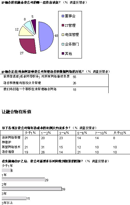 我們調(diào)查的企業(yè)中,有超過三分之二將在未來五年內(nèi)實現(xiàn)大多數(shù)或者所有部門向融合網(wǎng)絡(luò)的轉(zhuǎn)型。大部分企業(yè)采取按部就班的形式在某些特殊部門和業(yè)務(wù)開始部署。在融合應(yīng)用中,IP語音電話將在未來三年內(nèi)吸引大量投資;管理人士期望通過大幅削減公司內(nèi)部的通話費用獲得早期的回報。在更廣泛的層面上,大多數(shù)管理者預(yù)計,融合網(wǎng)絡(luò)對其企業(yè)的商業(yè)影響將會“非常重要”或者“重要”。