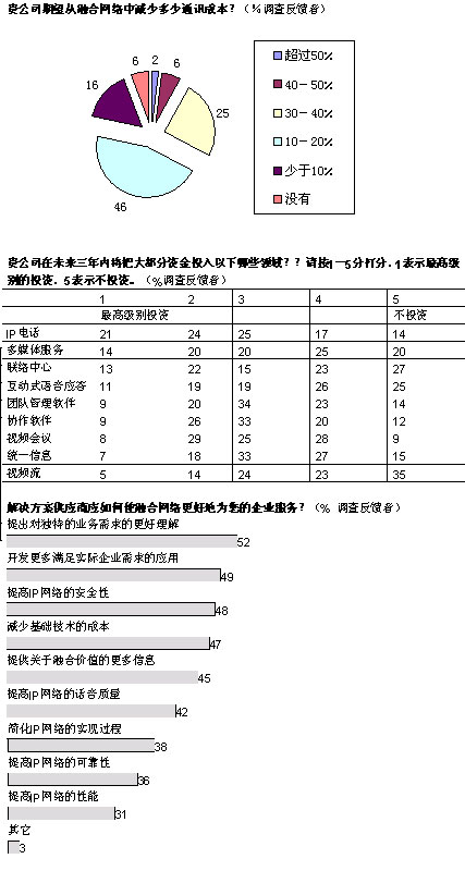 盡管如此,雖然IP融合的真正長期效益可能有利于提高員工效率,但是投資必須得到公司首席財務(wù)官的認可。在總體網(wǎng)絡(luò)成本中預(yù)計可以節(jié)約多少?大多數(shù)公司希望削減10%-20%的費用,也有相當一部分公司期望減少30%-40%的費用。上述報告中提到的實例中表明,這樣的節(jié)約是可以實現(xiàn)的。